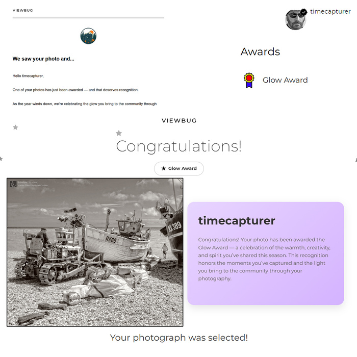 THE IMAGE “PUSHING THE BOAT OUT MONO” WAS COMMENDED AND SELECTED TO RECEIVE A SPECIAL “GLOW AWARD” BY THE VIEWBUG PHOTOGRAPHY WEBSITE CURATORS.